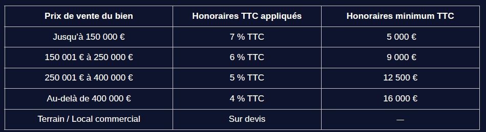 Les honoraires sont calculés sur le prix net vendeur et sont à la charge des acquéreurs : cf tableau ci-dessus.